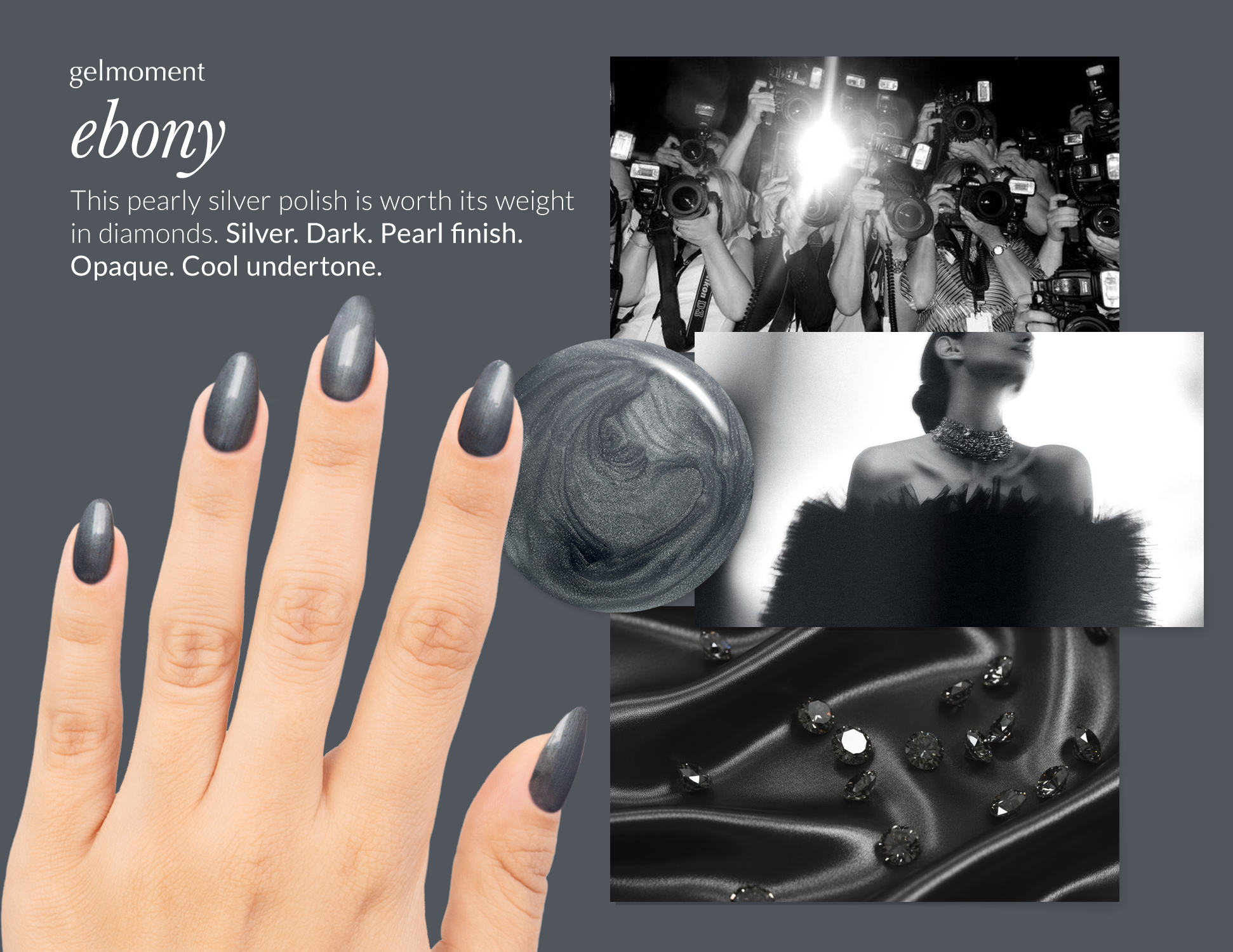 Gunmetal grey. Dark. Pearl finish. Opaque. Cool undertone.