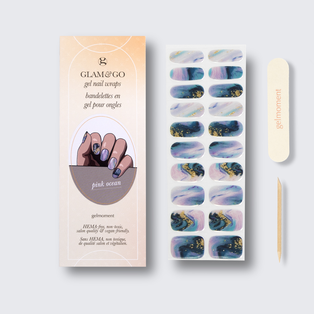 Plus, not only do GLAM & GO gel nail wraps provide the same glossy finish you know and love from our regular gel polish, but they are also HEMA FREE and have a wear time of up to 14+ days.
